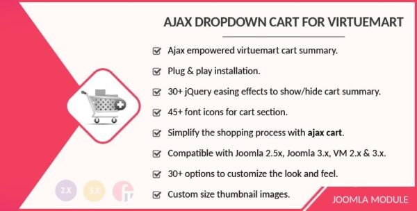 Virtuemart için Satış Sayfası Ajax Açılır Sepet, görünümü ve hissi özelleştirmek için birçok seçeneğe sahip basit, hafif, ajax destekli ve kullanıcı dostu bir erdemmart açılır sepet modülüdür. Son Derece Özelleştirilebilir Açılır Ajax sepetiyle alışveriş sürecini basitleştirerek satışlarınızı artırır.