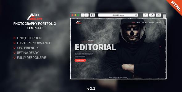 Satış Sayfası Alex – Zane, iPhone, iPad, Blackberry 6, Android ve masaüstünü destekleyen, özgür SEO, modern tasarım ve galeriye sahip bir fotoğraf portföyü şablonudur. Kullanımı kolaydır ve çalışmalarınızı ilginç etkileşimlerle potansiyel müşterilere ve işverenlere sergilemeye odaklanır.