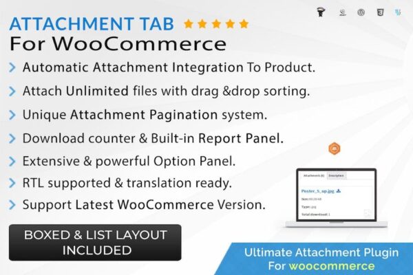 WooCommerce eklentisi için Satış Sayfası Ek Sekmesi, ürün açıklama sayfasına herhangi bir dosya eklemek için harika bir yol sağlar. Eklenti, ürünlerle ilgili tüm ekleri içeren ekler için otomatik olarak özel ve özel bir sekme oluşturur.