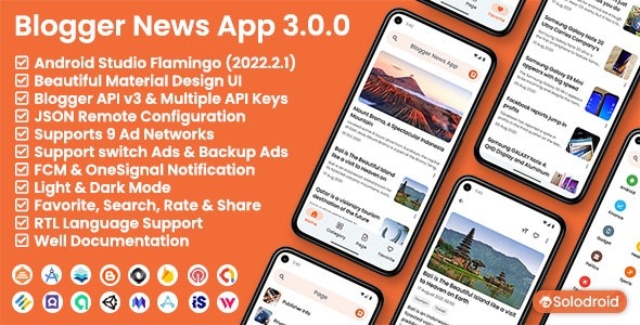Satış Sayfası Blogger Haber Uygulaması, Blogger Sitesindeki yayınları veya makaleleri görüntülemek için kullanılan Android uygulama şablonudur. Tüm Blogger yayınlarını, etiketlerini, sayfalarını ve gösterilerini güzel ve iyi tasarlanmış bir düzende yükler. Android platformu altında çalıştırın ve Java Programlama Dili ile Android Studio kullanılarak oluşturuldu; böylece uygulamanın yerel, hızlı ve sorunsuz çalışmasını sağlayın. Google Materyal Tasarımı kullanıcı arayüzünü uygulamak, uygulamayı tasarım ve kullanıcı deneyimlerinde güzelleştirir.
