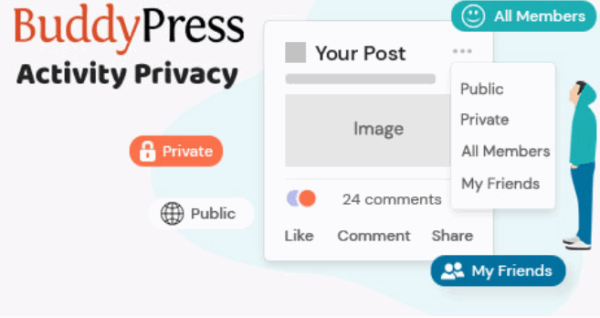 Satış Sayfası BuddyPress Etkinlik Gizliliği eklentisi, etkinlik akışı bileşenine bir gizlilik düzeyi ekler. Eklenti, üyelere etkinliğini kimlerin okuyabileceğini seçme yeteneği ekler (Herkes, Oturum Açmış Kullanıcılar, Arkadaşlarım, Yalnızca Yöneticiler, Yalnızca ben, Gruptaki Arkadaşlarım, Grup Üyeleri…vb).