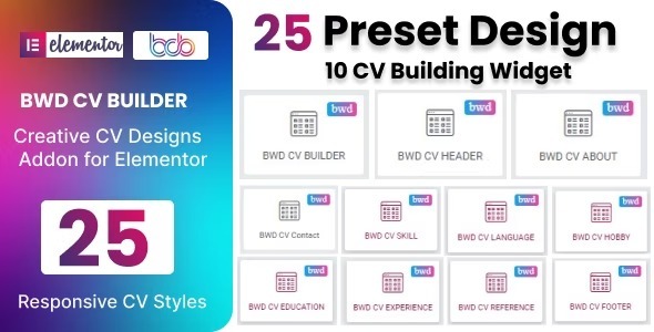 Satış Sayfası “BWD CV Builder”, herhangi bir kodlama bilgisi olmadan web sitenize çekici bir CV eklemek için kullanılan hafif bir Elementor tabanlı WordPress eklentisidir. Kendi tarzınızı yaratmanız için 25 benzersiz ön ayarlı CV tasarımı ve 10 ayrı widget bulunmaktadır. Kind bilgi için 100’den fazla tasarım çok yakında yer alacak.