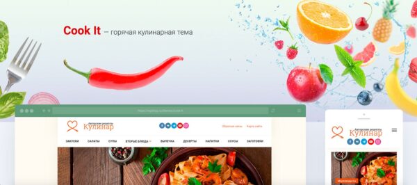 Satış Sayfası Cook It – Sıcak mutfak teması, malzemelerin ve adımların kolay eklenmesi, tarifler ve makalelerin mikro işaretlenmesi, yerleşik reklam birimleri, yerleşik işlevler.
