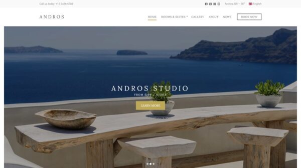 Satış Sayfası CSSIgniter Andros WordPress Teması Otelinizi veya tatil yerinizi şık bir şekilde sergilemek için özel olarak tasarlanmış güzel, duyarlı bir Otel WordPress teması. Konaklamanızın keyfini çıkarın.