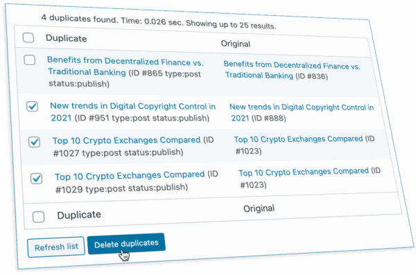 Satış Sayfası WordPress’teki yinelenen gönderilerden kolaylıkla kurtulun. Duplicate Posts Pro’yu Sil, WordPress için tam olarak adının söylediği şeyi yapan bir eklentidir. Yazılarınızdaki veya sayfalarınızdaki sayfa başlıklarını tarayan bir WordPress eklentisi; en eski veya en yeni sürümü saklar ve kalan ekstra veriler de dahil olmak üzere geri kalanını siler.