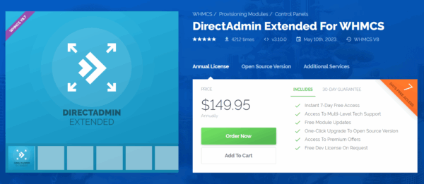 WHMCS İçin Satış Sayfası DirectAdmin Extended, web barındırma hesaplarının sağlanmasına otomasyon getirir ve aynı zamanda bunların tamamen uzaktan yönetilmesine olanak tanır. En sık kullanılan DirectAdmin özelliklerinin tümüne WHMCS istemci alanından erişilebileceği için müşterileriniz web sitenizden ayrılma zahmetinden kurtulacak.
