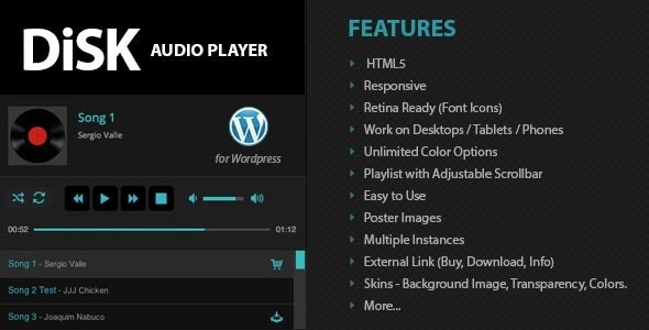 Disk Ses Oynatıcı (MP3 Çalar), web sitenizde html5 ses oynatıcısını sınırsız renk seçenekleri ve kaydırma çubuklu çalma listeleriyle görüntülemek için kullanılan bir WordPress eklentisidir. Ana Özellikler Yeni özellik eklendi! Şarkı Görüntüleme Sayısı HTML5 MP3 Çalar Dosya türleri: .mp3, .wav, .ogg Responsive Retina Hazır (Yazı Tipi Simgeleri) Masaüstü Bilgisayarlarda / Tabletlerde / Telefonlarda Çalışın Sınırsız Renk Seçenekleri Ayarlanabilir Kaydırma Çubuğu ile Çalma Listesi Kullanımı Kolay Poster Resimleri