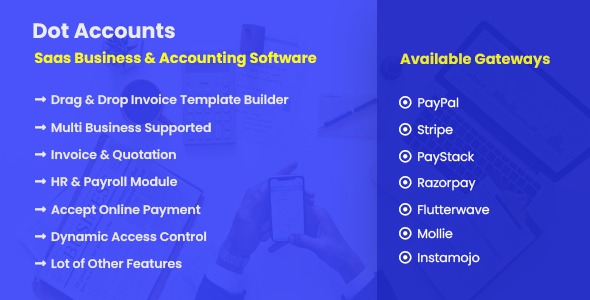 Satış Sayfası Nokta Hesapları, müşterilerinize abonelik satabileceğiniz ve müşterilerinizin hizmetlerinizi aylık/yıllık veya ömür boyu kullanabileceği Abonelik (SaaS) Tabanlı Çoklu İşletme ve Muhasebe yazılımıdır. Bu komut dosyası, teklifleri, faturaları, yinelenen faturaları, stok yönetimini ve faturalandırma ve muhasebeyle ilgili diğer tüm temel özellikleri yönetmek için gerekli tüm araçlarla birlikte gelir. Bu sistemin en ilginç ve benzersiz özelliği, herhangi bir kodlama bilgisi olmadan kendi fatura şablonunuzu oluşturabileceğiniz Sürükle ve Bırak Fatura Şablonu oluşturucusudur. Bu sistem PayPal, Stripe, Razorpay, PayStack, Flutterwave, InstaMojo ve Mollie gibi 7 popüler çevrimiçi ödeme ağ geçidiyle birlikte gelir. Ödeme ağ geçitleri esas olarak abonelik ödemesi için ve müşterilerden fatura ödemesini kabul etmek için kullanılır.
