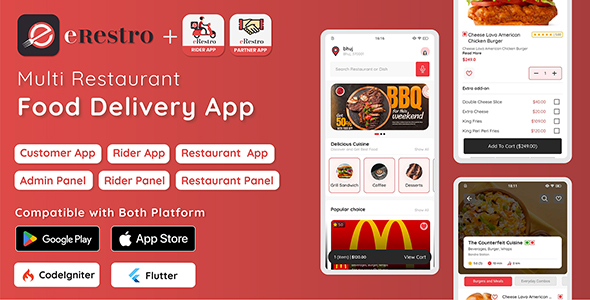 Satış Sayfası eRestro Flutter Çoklu Restoran ve Satıcı Pazaryeri – Hyperlocal İşletmeler için Yemek Siparişi Uygulaması eRestro, flutter ve Codeigniter ile oluşturulmuş çoklu restoran – tam teslimat uygulaması için eksiksiz bir çözümdür.