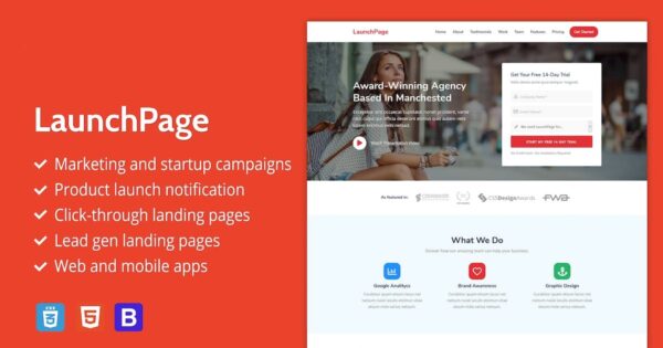 LaunchPage, ihtiyaçlarınıza göre özelleştirmesi çok kolay, temiz ve modern, yüksek dönüşüm sağlayan bir açılış sayfası şablonudur. Bu açılış sayfası şablonu her türlü pazarlama ve başlangıç web sitesini tanıtmak için kullanılabilir. Kurulumu hızlı ve kolaydır.