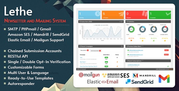 Satış Sayfası Lethe, e-posta bültenleri oluşturmaya yönelik bir web uygulamasıdır. Sirius PHP Dil Dosya Düzenleyicisini kullanarak birçok dili destekler. miniPAN PHP Dosya Yönetim Sistemi HTML editörü için gelişmiş dosya yöneticisi. point.tips aracılığıyla metinlerinizi içeren açılır pencere. Kolay kurulum; SMTP / PHPMail / GMail / Amazon SES / MandrillApp / SendGrid desteği; E-posta adresi onayı; Posta geri dönüş işleyicisi ve kural düzenleyicisi (153 kural dahil); WYSIWYG editörü; reCAPTCHA ve benzersiz form anahtarları; API desteği; RSS beslemesi ve daha fazlası.