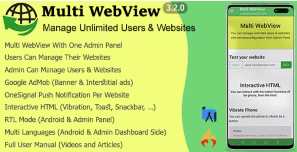 Multi WebView, çoklu webview uygulaması için kullanılan Android platformu altında çalışan, Android 4.2 ve üzeri desteği olan bir mobil uygulamadır. Web sitenizi native mobil uygulamaya dönüştürebilirsiniz. Sınırsız kullanıcıyı ve kullanıcı başına sınırsız web sitesini yönetebilirsiniz. Her kullanıcı kendi web sitesini kullanıcı panelinden yönetebilir ve yönetici, tüm kullanıcıları ve web sitelerini yönetici panelinden yönetebilir. Anlık Bildirim gönderme özelliği ve Google AdMob ayarları da yönetici panelinde yer almaktadır. Güçlü ve duyarlı Yönetici Paneli ile sınırsız kullanıcı ve web sitesini yönetebilirsiniz. Bu uygulama, istemci tarafı için Android Studio ve ardından yönetici tarafı için PHP MySQLi (Codeigniter) tarafından oluşturulmuştur. Dünyanın en popüler işletim sistemi olan Android platformu altında çalıştırın. Bu uygulamayı kullanarak kendi web sitesi uygulamanız için uygulama oluştururken paradan ve zamandan tasarruf edebilirsiniz. Uyarı: Yönetici panelinde oluşturduğunuz her web sitesi için yeni android projesi oluşturmalı ve Paket Adını değiştirmelisiniz. Ayrıca Firebase & OneSignal & AdMob kurulumunun ayrı ayrı yapılandırılması gerekir.