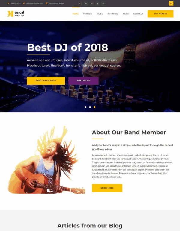 Musical Vibe Pro temiz, basit ve duyarlı bir WordPress temasıdır. Müzisyenler ve müzikle ilgili diğer gruplar ve müzik grupları için çok uygundur. Kullanımı kolaydır, kullanıcı dostudur ve kodla uğraşmanıza gerek kalmadan web sitenizi tamamen özelleştirmenize olanak tanır. Temanın çekici ve oldukça şık olması onu müzikle ilgili web siteleri için mükemmel bir seçim haline getiriyor. Sitenizi ihtiyacınıza göre özelleştirmeniz için çeşitli kullanışlı özellikler ve tema seçenekleri sunar. Tema çeviriye hazırdır ve en iyi performans için optimize edilmiştir.