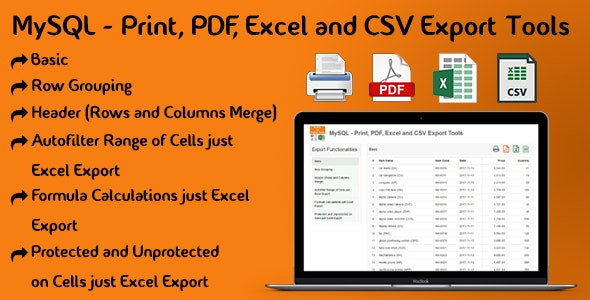 Satış Sayfası MySQL – Yazdırma, PDF, Excel ve CSV Dışa Aktarma Araçları, Yazdırma, PDF, Excel ve CSV dosyalarını MySQL Veritabanınızdan dışa aktarmanıza olanak tanıyan bir web uygulamasıdır. Excel çalışma sayfası adı, yazı tipi, yazı tipi boyutu, hücrelerin dolgu rengi, hücrelerin kenarlık rengi, dikey metin hizalaması, yatay metin hizalaması ve hücre genişliği gibi kolayca değiştirilebilir şekilde kolayca özelleştirilebilir. Yazdırma, PDF, Excel ve CSV hücreleri sayı formatlarını ve veri doğrulamayı ayarlar. MySQL Verileri satırları grup halinde ve başlık olarak gösteriyor (satırlar ve sütunların birleşimi). Excel çalışma sayfası hücrelerinde kolayca korumalı ve korumasız ayarlayabilirsiniz. Genel uygulama hızını artıracak benzersiz özelliklere sahiptir ve aynı zamanda gerçekten hızlı bir yapılandırmaya olanak tanır, böylece hemen başlayabilirsiniz.