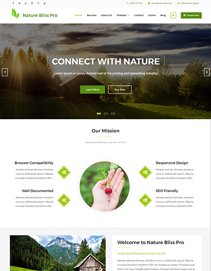 Satış Sayfası Nature Bliss Pro, çevre dostu işletmeler ve kar amacı gütmeyen kuruluşlar göz önünde bulundurularak oluşturulmuştur, ancak yalnızca bunlarla sınırlı değildir. Doğa odaklı işletmeler ve markalar için güzel ve açık sözlü bir temadır. Taze, dünyevi tasarımı hem duygusal hem de profesyoneldir. Yaban hayatı koruma bağış kampanyaları, organik yaşam projeleri, koruma hareketleri veya diğer ilgili kuruluşlar için ilgi çekici sayfalar oluşturabileceksiniz. Çevre dostu bir web sitesi geliştirmek istiyorsanız bu tema doğru seçimdir.