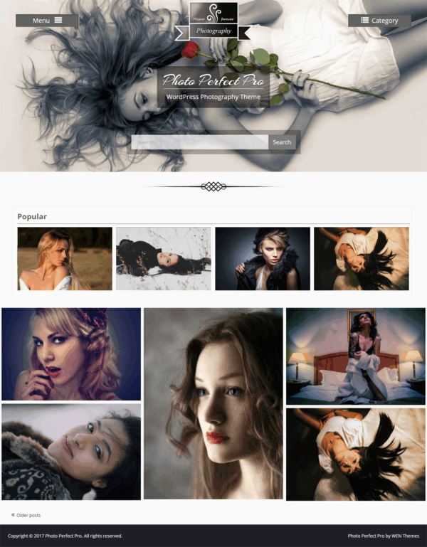 Satış Sayfası Photo Perfect Pro, profesyonel fotoğrafçılar, fotoğraf blog yazarları ve yaratıcı meraklılar için duyarlı bir fotoğrafçılık WordPress Temasıdır. Temanın günlük olarak özelleştirilmesi, bakımı ve kullanımı çok kolaydır. Yaratıcı ve yenilikçi çalışmaları aracılığıyla güçlü bir çevrimiçi marka varlığı oluşturmak istiyorsanız bu tema tam size göre.