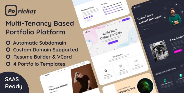 Satış Sayfası Porichoy, müşterilerin 5 dakika içinde portföy web siteleri oluşturabilecekleri çoklu kiracılığa dayalı bir portföy platformudur. Bu komut dosyası, alt etki alanını, özel etki alanını ve ayrıca portföy URL’si için yol tabanlı etki alanını destekler. Herkes bu betiği kullanarak her türlü portföy sitesini oluşturabilir. Müşteriler portföy web siteleri, çevrimiçi CV, VCard (Çevrimiçi Kartvizit) ve QR Oluşturucular oluşturabilir. 4 portföy temasını, 2 VCard temasını, 5 çevrimiçi özgeçmiş temasını entegre ettik ve 12 ödeme fırsatı ekledik. Tüm ödeme Kaçamakları korumalı alan modunu ve canlı modu destekler ve tamamen güvenlidir
