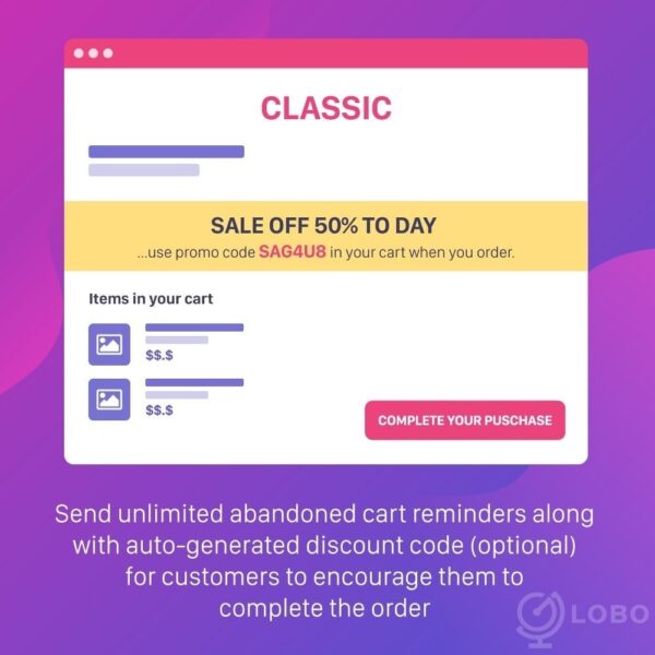 Prestashop Terk Edilmiş Sepet Hatırlatma Modülü, terk edilmiş sepetleri beş farklı yöntemle kurtarır: E-posta, Açılır Pencere, Yapışkan Çubuk, Tarayıcı Bildirimi, Tarayıcı Sekmesi Bildirimi. Hem müşteriler hem de ziyaretçiler için terk edilmiş arabayı kurtarın. Satışlarınızı %50 artırın.
