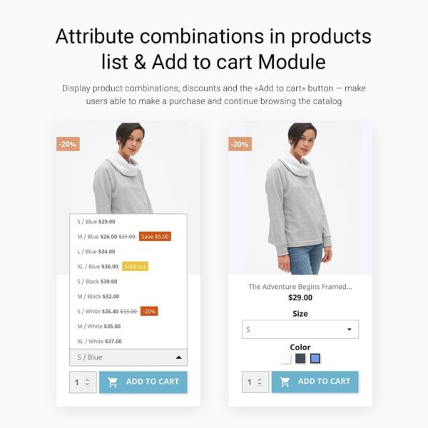 Ürün Listesinde Nitelik veya Kombinasyonları Göster Katalogda kullanıcılara yeterli ürün bilgisi sağlayarak dönüşüm oranınızı artırın. Ürün kombinasyonlarını, indirimleri, stok durumunu ve «Sepete ekle» seçeneğini görüntüleyin; kullanıcıların satın alma işlemi gerçekleştirmesine ve kataloğa göz atmaya devam etmesine olanak tanıyın.