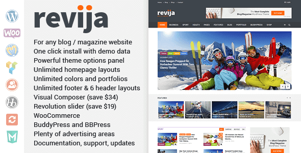 Satış Sayfası Revija Gazete WordPress BuddyPress, haber, gazete, dergi, yayıncılık, incelemeler, eğlence, sağlık, yüksek teknoloji, moda, seyahat, spor, iş dünyası, politika ve diğerleri için modern ve premium bir temadır!