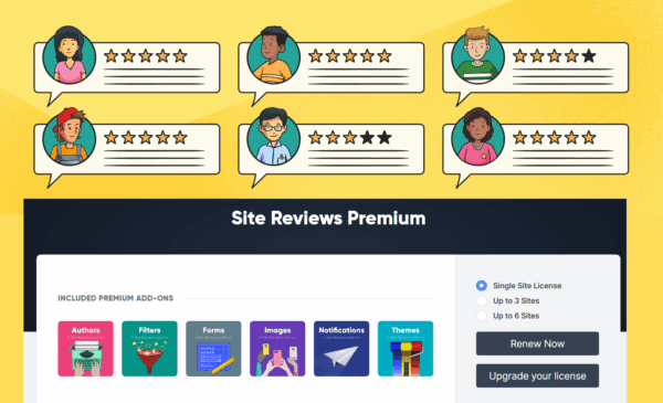 WordPress Repo – Satış Sayfası Site İncelemeleri, web siteniz için Amazon, TripAdvisor ve Yelp’e benzer şekilde çalışacak şekilde tasarlanmış eksiksiz bir inceleme yönetimi çözümüdür. Eklenti, tüm belgelerin yanı sıra bloklar, kısa kodlar ve widget’lar sağlar. En iyi incelemelerinizi her zaman ilk sırada gösterilmeleri için sabitleyebilir, incelemeleri doğrulanmış olarak işaretleyebilir, yeni incelemeler yayınlanmadan önce onay gerektirebilir, ziyaretçilerin yorum yazabilmeleri için oturum açmalarını gerektirebilir, incelemeler gönderildiğinde özel bir bildirim gönderebilir, incelemelere yanıt verebilir ve çok daha fazlasını yapabilirsiniz! Tüm Eklentiler Dahildir site-reviews-themes-v1.0.0-beta36 site-reviews-authors-v1.0.0-beta6 site-reviews-filters-v2.4.3 site-reviews-forms-v1.15.0 site-reviews-images-v3.4.0 site-reviews-notifications-v1.2.0
