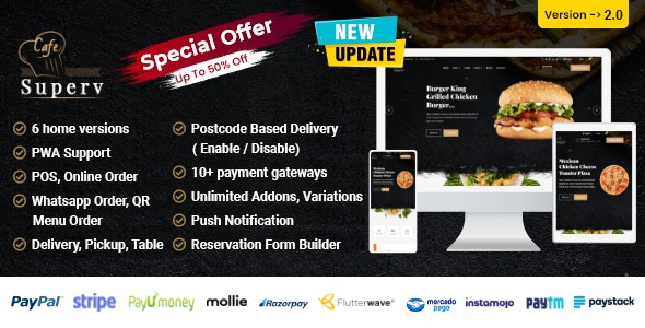 Satış sayfası “Superv”, bir restoranın sunduğu neredeyse tüm özellikleri sunan bir restoran web sitesi CMS & yönetim sistemidir. Bu sistem, fast food dükkanı, kahve dükkanı, pasta dükkanı, fırın dükkanı vb. Gibi herhangi bir yiyecek dükkanı / restoran işletmesi için kullanılabilir. Tasarım, bir restoranın görünümüne ve hislerine dayanarak yapılır. İşletme sahibi yiyecek menülerini, yiyeceklerini gösterebilir ve web sitesinin tüm içeriğini değiştirebilir. Müşteriler çevrimiçi ödeme yaparak web sitesinden yiyecek sipariş edebilir. İşletme sahibi bu siparişi yönetici panelinden yönetebilir ve ayrıca sahibi diğer yöneticiler oluşturabilir ve yönetici panelinin belirli bölümlerine izin verebilir. Aşırı olarak, restoran işlerinin her boyutu için mükemmeldir.