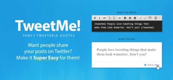 Satış Sayfası TweetMe Pro, blog okuyucularınız için kolayca tweetlenebilir süslü içerik ve alıntılar oluşturmanıza olanak tanır. Basit bir kısa kod kullanarak seçtiğiniz metin vurgulanır ve tek bir tıklamayla Twitter’da paylaşılabilecek şekilde tweetlenebilir hale getirilir! İnsanların sizi değil, içeriğinizi tweetlemesini sağlayın!