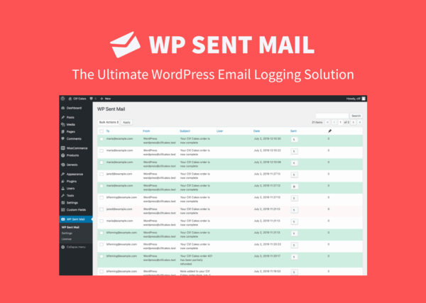 Satış Sayfası WordPress sitenize bir Gönderilmiş Posta klasörü ekleyin. Hangi e-postaların gönderildiğini ve ne zaman gönderildiklerini görün. Veya WordPress’in test ortamınızda e-posta göndermesini engelleyin, ancak yine de bunları test için yakalayın. WP Sent Mail Özellikleri Tam özellikli bir e-posta günlüğü çözümü. Tam E-posta Önizlemesi E-postaları tam olarak müşterilere gönderildikleri haliyle görüntüleyin. E-posta şablonlarında hata ayıklamanın mükemmel bir yolu. E-postaları Yeniden Gönder Müşteri makbuzunu almadı mı? Tek tıklamayla tam bir kopyayı yeniden gönderin! Ekleri Görüntüle WP Sent Mail, ekler de dahil olmak üzere giden e-postaların tam bir kopyasını kaydeder. Uçak Modu Bir geliştirme sitesinde mi çalışıyorsunuz? Uçak Modu giden e-postaları günlüğe kaydeder ancak göndermeyi devre dışı bırakır. Açık İzleme WP Sent Mail, görünmez bir izleme pikseli ekleyerek e-posta açılışlarını otomatik olarak izleyebilir. Yönetici Widget’ı Yakın zamanda bir yönetici widget’ı ekledik! WP Sent Mail ile gönderilen ve kaydedilen en son 10 e-postaya hızlı bir genel bakış alın.