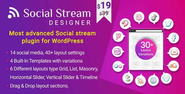 Satış Sayfası WP Social Stream Designer eklentisi bunun için mükemmeldir. Eklenti, WordPress web sitenizde size güzel ve duyarlı bir duvar sağlamak için Twitter, Instagram, Facebook, RSS ve daha pek çok platformdan sosyal medya içeriği almak için kullanılır. Tüm sosyal ağ yayınlarınızı tek bir ağ akışında birleştirebilir veya farklı tasarım ve düzenlerle tek bir sosyal ağ yayınını görüntüleyebilirsiniz. Eklenti site ziyaretçilerinizden herhangi bir veri toplamayacaktır. Yani GDPR uyumludur.