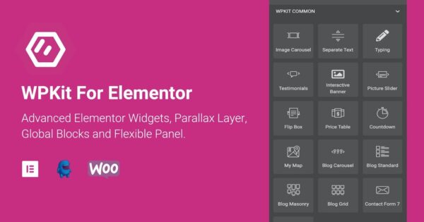 Satış Sayfası WPKit For Elementor eklentisi, temel olarak birçok gelişmiş Elementor widget’ı, paralaks katmanı, esnek panel ve global blok modülü sunan premium bir Elementor Eklentisidir. ayrıca çeşitli ürün düzenleri, sepet düğmesi ve ürün arama widget’ı gibi WooCommerce ve Kolay Dijital İndirmelerle de uyumludur. Elementor’un ücretsiz sürümüyle çalışır, Pro sürümüne gerek yoktur!